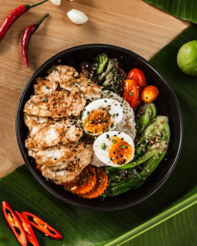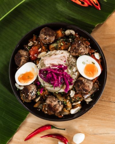Fried chicken chili sauce coated, bell pepper, topped with fried egg served with brown rice