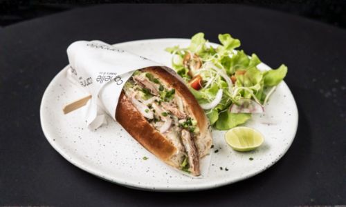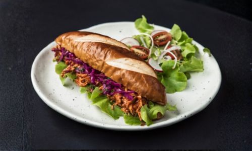 Grilled chicken, pesto sauce, Kalamata olives, tomato confit, red onion, lettuce, mayonnaise served in a bretzel bagel