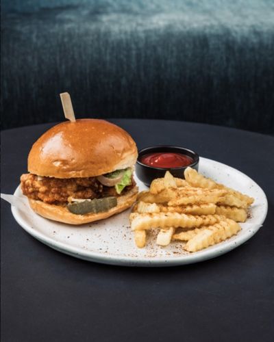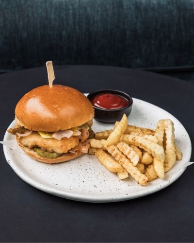 Fried marinated chicken, cheese, pickled red onion and cucumber, burger sauce, iceberg lettuce