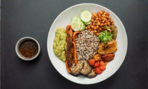 Organic quinoa, black beans, char-grilled vegetables, chickpeas, smashed avocado, tomato salsa, sweet potato served with sesame dressing
