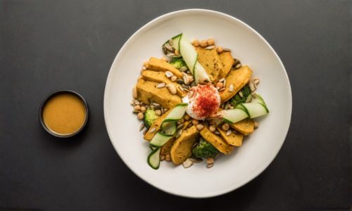Roasted pumpkin, guacamole, chickpeas, broccoli, poached egg, mixed seeds, nuts served with honey-mustard dressing
