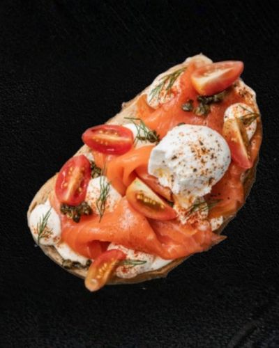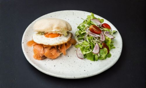 Salmon topped with Fried Egg 320 THB