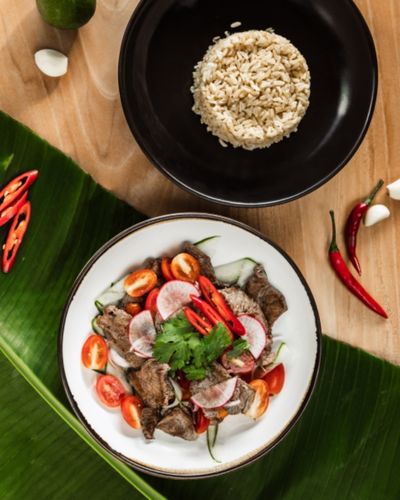 Australian grilled beef ribeye, cucumber, cherry tomatoes, red onion, celery, red radish served with Thai dressing