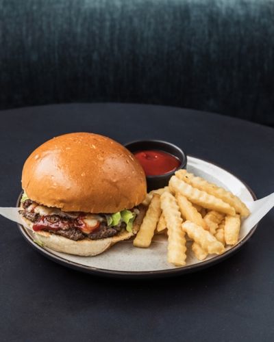 Wagyu beef patty, Emmental cheese, burger sauce, pickled cucumber, caramelized onions, iceberg lettuce